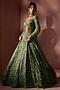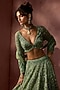 Nitika Gujral presents an exquisite Sage Green Lehenga crafted in a net base, adorned with beads, sequins and crystal embroidery. It is paired with a finely embroidered blouse and an embroidered dupatta. Elevate this designer ensemble with kundan polki jewellery, a floral hairdo, and embellished block heels for a striking bridal look, perfect for weddings or engagements ceremonies.