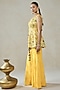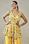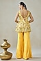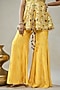 Nitika Gujral features a yellow peplum top in viscose georgette, shantoon and silk base with mirror, thread and floral motif embroidery. It is paired with sharara pants. Accentuate it with meenakari earrings, a potli bag and block heels for festive occasions, haldi or sangeet ceremonies.