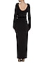 Featuring a black gown in lycra base with full sleeves, shoulder pads and fur embellished belt.