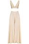 This set features a beige tie up peplum top in organza base with knotted detailing on side front. It is paired with matching beige cotton sharara pants and bralet.