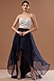 Featuring a navy blue high-low asymmetric skirt in silk organza base with an elasticated waist and beads embroidery.