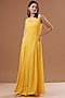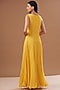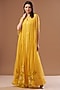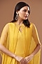 Featuring a yellow long cape in tulle, crepe and georgette base with feather fringes and bugle beads hand embroidery. It is paired with a matching dress.