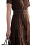 Featuring a chocolate brown pleated midi dress in cotton poplin base with a shirt collar and belt detailing. It is paired with a belt. Style this dress with standout accessories like bold jewelry or a vibrant scarf for a complete look.