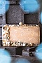 Featuring a beige and gold box clutch in resin base with a twist closure and embellishments. It has a shoulder strap.