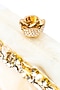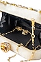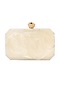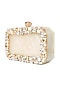 Featuring a beige and gold box clutch in resin base with a twist closure and embellishments. It has a shoulder strap.