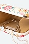Featuring a cream and pink box clutch in satin base with print and a twist closure. It has a shoulder strap.