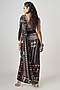 Featuring a black pre-draped saree in crepe base with print, sequins, thread, kantha, bead and hand embroidery. It is paired with a blouse having fringe detail. Accentuate it with statement earrings and metallic heels, perfect for cocktail nights.