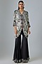Featuring an off-white short kite top in crepe base with hand embroidery. It is paired with crepe and lycra black gharara pants. Accentuate it with statement earrings and heels for cocktail or wedding ceremonies.