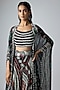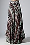 Featuring a black lehenga in crepe and georgette base with print, kantha, fringes, beads and sequin thread hand embroidery. It is paired with a tribal blouse and kaftan jacket. Accentuate it with statement silver or oxidised earrings and elegant heels for a stylish ensemble, ideal for festive gatherings, pre-wedding functions or bohemian-inspired celebrations.