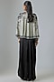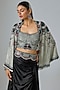 Featuring an off-white short cape in georgette base with hand embroidery. It is paired with a black crepe and lycra bustier, including a satin drawstring skirt. Accentuate it with statement earrings and heels for cocktail or wedding ceremonies.