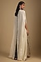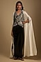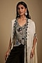 Featuring an off-white slit cape in satin base. It is paired with a black crepe and lycra waistcoat having sequins, thread, beads and thread hand embroidery, including a satin drawstring skirt. Accentuate it with silver jewellery and heels for a sangeet or cocktail ceremony.