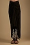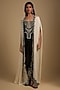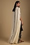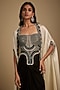 Featuring an off-white slit cape in satin base. It is paired with a black crepe corset having sequins, thread, beads and thread hand embroidery, including a satin embroidered pick-up skirt. Accentuate it with silver jewellery and heels for a sangeet or cocktail ceremony.