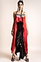 Featuring a red singlet top in satin base with hand embroidery. It is paired with contrasting black gathered circular skirt.