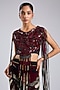 Featuring a burgundy crop top in crepe and lycra base with sequin fringe detail and hand embroidery. It is paired with a chiffon printed crushed skirt. Accentuate it with statement dangler earrings, sleek ponytail and heels for a cocktail party or engagement parties.