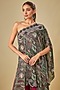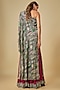 Featuring a black one-shoulder cape in crepe and lycra base with print and hand embroidery. It is paired with burgundy embroidered gharara pants. Accentuate it with statement earrings and heels for a festive ceremony.