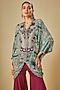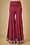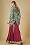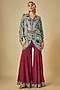 Featuring a teal green short kite style-top in crepe base with print and hand embroidery. It is paired with burgundy crepe and lycra gharara pants. Accentuate it with statement earrings and heels for a festive ceremony.
