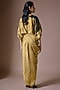 Featuring a dark gold wrap dress in banarasi silk base. Style it with delicate jewellery and strappy heels for a graceful look. Perfect for intimate gatherings, cocktail evenings, and grand soirees.