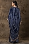 Featuring a dark navy blue gathered kaftan jacket in crepe base with bandhani print and zardosi hand embroidery. It is paired with matching A-line pants and an off-white scalloped blouse.
