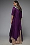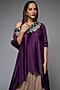 Featuring a purple off-shoulder top in satin base with mirror cutwork embroidery. It is paired with contrasting dusty rose crepe circular sharara pants having peacock print.