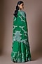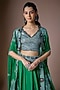 Featuring an emerald green cape in satin base with hand embroidery. It is paired with a blouse having a sweetheart neckline and a lehenga. Accentuate it with statement jewelry and heels for a regal look, ideal for the wedding day and reception.