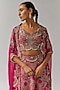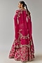 Featuring a fuchsia dupatta cape in georgette base with mirror cutwork embroidery. It is paired with a silk embroidered lehenga and a crepe blouse. Accentuate it with statement jewellery and heels for weddings.