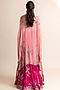Featuring a fuchsia lehenga in silk base with mirror, swarovski, metallic sequins, studs and pearls hand embroidery, including a can-can. It is paired with a matching crepe and satin lycra blouse, including a dusty-rose georgette cape.