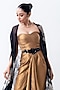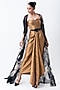 Featuring a gold dress in banarasi silk base. It is paired with a chiffon black printed cape . Accentuate it with statement earrings and elegant heels for a stylish ensemble, ideal for cocktail evenings.