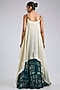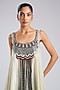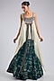 Featuring an off-white strappy singlet top in satin base with fringes, beadwork, kantha and hand embroidery. It is paired with a green silk printed skirt. Accentuate it with traditional kundan jewelry, soft curls and heels for a wedding reception, mehndi or festive occasion.