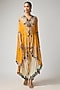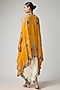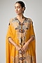 Featuring a mustard cape in silk satin base with hand embroidery. It is paired with off-white draped pants. Accentuate it with statement jewellery and block heels for a festive occasion, wedding or haldi ceremony.