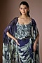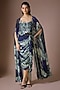 Featuring a navy blue cape in chiffon, crepe and lycra base. It is paired with a silver embroidered blouse and a skirt. Accentuate it with gold jewellery, embellished heels, a sleek bun and a potli bag for a sangeet look or cocktail soirees.