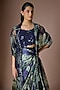 Featuring a navy blue jacket in organza base with print. It is paired with a bustier and a printed side-knotted skirt. Accentuate it with zircon jewellery and stilettos for a festive occasion or evening soirees.