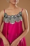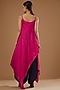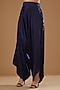 Featuring a red singlet top in satin base with hand embroidery. It is paired with a contrasting navy blue draped pants.