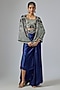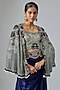 Featuring a navy blue short cape in georgette base with sequins, thread, kantha and beads hand embroidery. It is paired with a crepe and lycra bustier, including a satin drawstring skirt. Accentuate it with silver or swarovski jewellery and heels for a wedding or sangeet ceremony.
