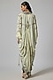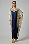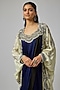 Featuring a navy blue gathered kite dress in satin base with mirror, swarovski, metallic, sequins and pearl hand embroidery. It is paired with an off-white crepe embroidered cape. Accentuate it with silver or swarovski jewellery and heels for a festive occasion.