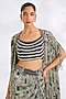 Featuring an off-white gathered cape in bemberg chiffon base. It is paired with a crepe and lycra embroidered top, including a bemberg chiffon skirt. Accentuate it with statement jhumkas, a vibrant potli bag and embellished juttis for a stylish ensemble, ideal for festive gatherings, sangeet nights, or celebratory occasions.