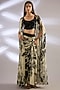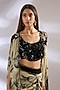 Featuring an off-white cape in chiffon base with slits on both side and print. It is paired with a crepe and lycra sequins strappy blouse and a satin skirt. Style with statement earrings and soft waves to elevate the glam factor, Ideal for sangeet, evening celebrations, or destination festivities.