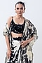 Featuring an off-white jacket in crepe, satin, organza and lycra base with print. It is paired with a printed skirt having french knot detail and a black strappy sequins blouse. Accentuate it with statement earrings and elegant heels for a stylish ensemble, ideal for cocktail evenings.