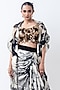 Featuring an off-white jacket in crepe, satin, organza and lycra base with print. It is paired with a printed skirt having drawstring detail and a gold strappy sequins blouse. Accentuate it with statement earrings and elegant heels for a stylish ensemble, ideal for cocktail evenings.