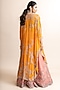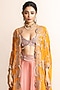 Featuring an old-rose lehenga in organza and satin base with mirror, swarovski, metallic sequins, studs and pearls hand embroidery, including a can-can. It is paired with a matching crepe and satin lycra blouse, including a georgette triangle cape.