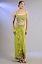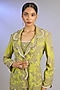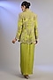 Featuring a pista green blazer in crepe base with hand embroidery. It is paired with a crepe and lycra bustier, including a satin pick-up skirt. Accentuate with statement jewellery and heels for a wedding or mehendi ceremony.