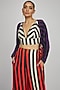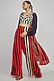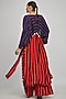 Featuring a purple and orange kimono jacket in crepe base with printed stripes. It is paired with a bustier and A-line pants. Accentuate it with dangler earrings and heels for a complete look.