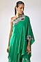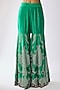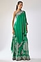 Featuring a sea green double-layered one-shoulder cape in satin crepe and lycra base with sequin, thread, kantha, beadwork and fringes hand embroidery. It is paired with embroidered gharara pants. Accentuate it with statement earrings and heels for a festive ceremony.