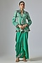 Featuring a sea green peplum jacket in silk and crepe base with sequins, thread, kantha and beads hand embroidery. It is paired with a satin cowl skirt. Accentuate it with silver or swarovski jewellery and heels for a wedding or mehendi ceremony.