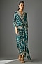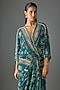 Featuring a teal wrap dress in crepe base with digital print and embroidery. Accentuate it statement earrings and block heels for festive dinners or family gatherings.