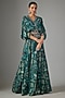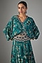Featuring a teal kimono wrap top in crepe base with digital print, beadwork and hand embroidery. It is paired with a printed kalidar lehenga. Accentuate it with dangler earrings and heels for a festive occasion, mehendi ceremony or cocktail.