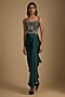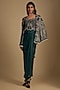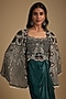 Featuring a teal maxi dress in satin base with thread, sequins, kantha and beads hand embroidery. It is paired with a black crepe embroidered short cape. Accentuate it with statement earrings and heels for a festive occasion.