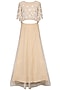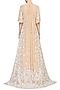 Featuring a beige cape blouse in silk crepe base appliqued with floral net lace cutwork highligted with pearl, crystal and beads on the cape sleeves. It is paired with beige silk crepe flared lehenga skirt.