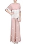 This set features a blush top in silk crepe base with an ivory dori and beaded fringe tassel detailing around the bottom hem. It is paired with blush silk crepe palazzo pants with an ivory sequinned 3D handcut petal embroidered motifs all over.