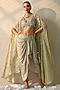 Featuring a gold blouse in tissue silk base with mirror hand embroidery. It is paired with a silk-lycra georgette skirt and a tissue silk cape. Accentuate it with jewellery, embellished heels and a potli bag for festive occasions or wedding ceremonies.