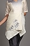Featuring a beige short jacket kurta in chanderi silk base with appliques embroidery and stripes. It is paired with contrasting grey pants.